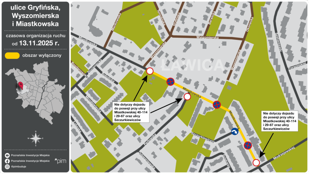 Rozpoczyna się inwestycja związana z przebudową ulic Gryfińskiej i Wyszomierskiej, połączona z wykonaniem kanalizacji deszczowej w ul. Miastkowskiej. Prace startują 13 listopada. Tego dnia zamknięty zostanie fragment ul. Miastkowskiej na odcinku od ul. Modrzejewskiej do Wyszomierskiej. Dopuszczony będzie wyłącznie dojazd do posesji. Mieszkańcy proszeni są o zachowanie ostrożności i stosowanie się do tymczasowego oznakowania.
