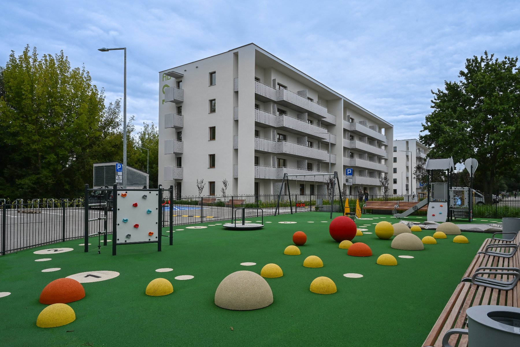 Projekt uwzględnia ekologię – na dachach budynków, stropie hali garażowej i wiatach śmietnikowych posadzono zieleń, zamontowano budki lęgowe dla jerzyków, a w sąsiedztwie pojawiły się drzewa i rośliny w donicach. Mieszkańcy mogą też samodzielnie sadzić rośliny w przygotowanych misach.