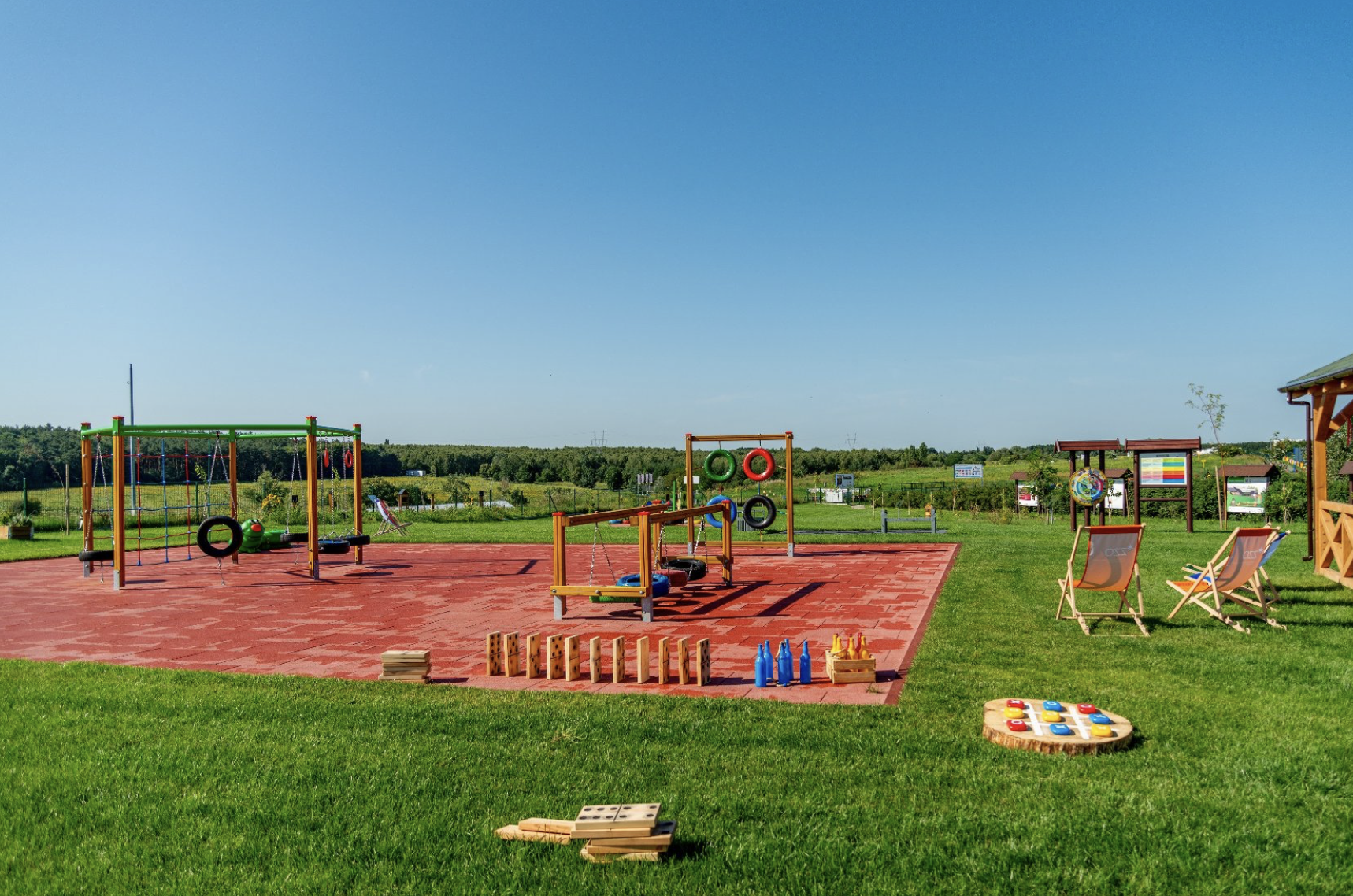 Na placu zabaw można znaleźć jeszcze więcej oryginalnych atrakcji, w tym muzyczną grę stworzoną z używanych rur PCV oraz garnków, a także XXL domino i duże warcaby. Dodatkowo, dostępne są inne gry, takie jak kółko-krzyżyk, gdzie plansze wykonane są z słoików topoli, a kolorowe kamienie pełnią rolę pionków, oraz rzut do celu, w którym elementy zbudowane z starych palet i wiader stanowią cel dla woreczków. Osoby, które lubią wyzwania i chcą sprawdzić swoją wiedzę, mogą również zakręcić kołem, aby wylosować pytanie dotyczące ekologii.